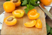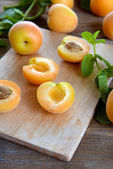 dojrzałe morele z zielonej mięty pozostawia na deski do krojenia, na tle drewniane