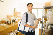 Zadowolony z zakupów. Atrakcyjna młoda kobieta uśmiecha się i nawiązuje kontakt wzrokowy kupując orzechy w ekologicznej hurtowni