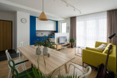 Zdjęcie "Mały salon z TV na drewnianej szafie i duże okno otwarte na nowoczesną kuchnię z białymi i niebieskimi meblami" może być wykorzystywane do celów osobistych i komercyjnych zgodnie z warunkami zakupionej licencji Royalty-free. Obraz jest dostępny do pobrania w jakości wysokiej rozdzielczości do 5760x3840.