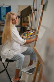 Piękna młoda kobieta garncarz za pomocą laptopa w warsztacie garncarskim
