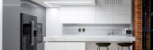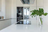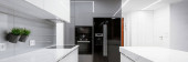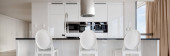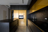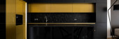 Zdjęcie "Panorama nowoczesnej kuchni z czarno-złotymi meblami z dużą wyspą kuchenną otwartą na fantazyjną jadalnię ze stylowym stołem i eleganckimi krzesłami i marmurowymi płytkami na podłodze i ścianie" może być wykorzystywane do celów osobistych i komercyjnych zgodnie z warunkami zakupionej licencji Royalty-free. Obraz jest dostępny do pobrania w jakości wysokiej rozdzielczości do 5760x3840.