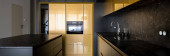Panorama nowoczesnej kuchni z czarno-złotymi meblami z dużą wyspą kuchenną otwartą na fantazyjną jadalnię ze stylowym stołem i eleganckimi krzesłami i marmurowymi płytkami na podłodze i ścianie