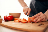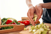 krojenie świeżych warzyw przygotowujących sałatkę w kuchni świeżej żywności