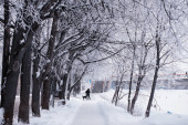 Samotna sylwetka mężczyzny wędrująca po zaśnieżonym chodniku w zimowym parku. Scena spokojna i humorzasta, osoba spacerująca ścieżką w śniegu, zamieć śnieżna z wiatrem trzęsącym wysokimi gałęziami drzew
