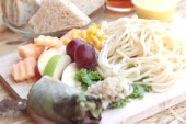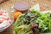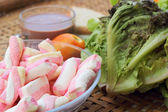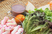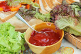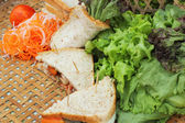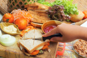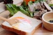 gorąca czekolada i porcję różowy tuńczyka kanapka.