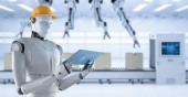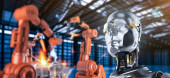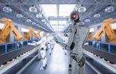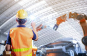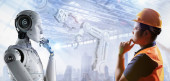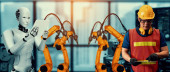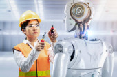 Technik lub inżynier pracuje z robotem renderującym 3d w fabryce