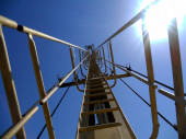 Wysoka, żółta, metalowa wieża ze schodami. Wieża komunikacyjna naprzeciwko nieba. Widok z dołu w górę.