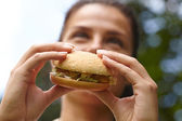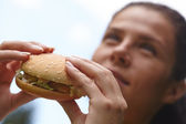 Kobieta jedzenie hamburgerów i koktajl
