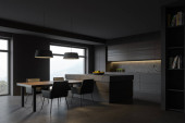 Zdjęcie "Wnętrze ciemnej kuchni ze stołem jadalnym, dwunastoma krzesłami, betonową podłogą, kuchenką elektryczną i panoramicznym oknem z widokiem na okolicę. Współczesny skandynawski minimalistyczny design. 3d renderowanie" może być wykorzystywane do celów osobistych i komercyjnych zgodnie z warunkami zakupionej licencji Royalty-free. Obraz jest dostępny do pobrania w jakości wysokiej rozdzielczości do 5760x3840.
