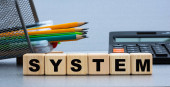 SYSTEM INWENTORII - słowa na papierze notatkowym na tle kalkulatora i spinaczy. Koncepcja przedsiębiorstwa