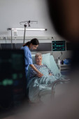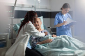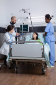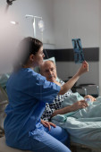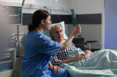 Pielęgniarka medyczna analizująca rentgen starszego pacjenta w pokoju szpitalnym