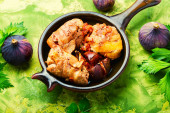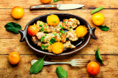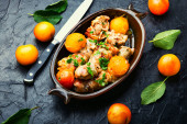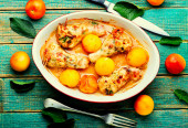 Kurczak nadziewany grzybami i wiśniową śliwką. Dania z mięsa pieczonego z owocami