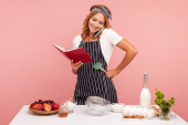 Młody dorosły skoncentrowany żeński cukiernik mieszający krem w misce mikserskiej, patrząc na procesor żywności, proces livestreaming robi ciasto. Kryty studio strzał izolowany na różowym tle.