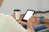 Mężczyzna czyta online magazyn na tablecie w pomieszczeniach, zbliżenie