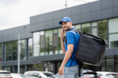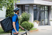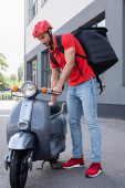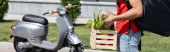 Widok z boku arabski kurier gospodarstwa pole z warzywami w pobliżu skuter na zewnątrz