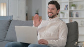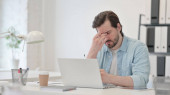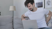 Zmęczony młody człowiek z laptopem ma ból głowy w domu