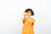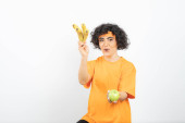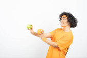 kobieta w pomarańczowym t-shirt pozowanie z jabłkiem i pomarańczą