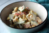 Sałatka z ziemniaków, kiełbasy, grochu, marchwi i ogórków. Olivierze. Miejsce na tekst.