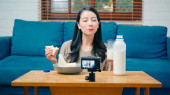Zdjęcie "Portret młodej blogerki azjatyckiej pani ćwiczeń i patrząc na aparat fotograficzny w kuchni, Atrakcyjne piękne indyjskie kobiety pracuje dla zdrowych w domu. Kobieta ćwiczy w domu koncepcja." może być wykorzystywane do celów osobistych i komercyjnych zgodnie z warunkami zakupionej licencji Royalty-free. Obraz jest dostępny do pobrania w jakości wysokiej rozdzielczości do 5760x3840.