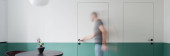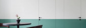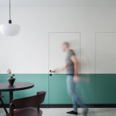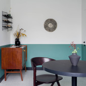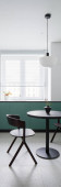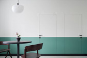 Nowoczesny design w jadalni z półzielonymi i białymi drzwiami i ścianą oraz z ciemnym stołem i krzesłem pod nową lampą