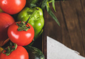 Drewniana miska pełna świeżych soczystych czerwonych pomidorów umieszczonych na kamiennym stole. Wysokiej jakości zdjęcie