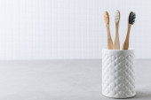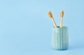 Dwie przyjazne dla środowiska bambusowe drewniane szczoteczki do zębów w szklance na niebieskim tle. Światło twarde.