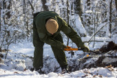 myśliwy lub kłusownik z bronią zbliża się na nartach do świeżych śladów ptaków w śniegu