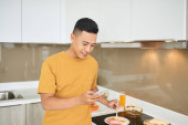 przystojny młody człowiek jedzenie smaczne quesadilla w domu