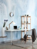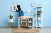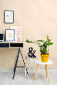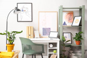 Wnętrze stylowego pokoju z nowoczesnym miejscem pracy i zdjęciami