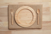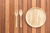 Pusty talerz z drewnianym widelcem i łyżką na czarnym tle