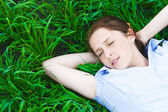 piękna nastolatka, leżącego na plecach w zielonej trawie