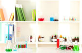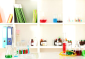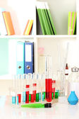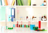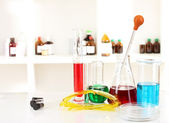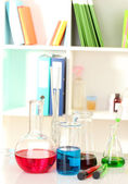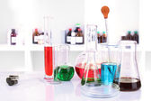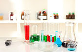 różne Naczynia laboratoryjne z kolor płynu na tle laboratorium
