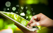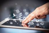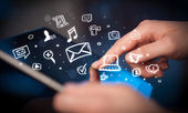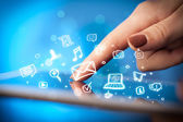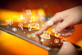 Palec wskazujący na tablet, koncepcja mediów społecznościowych