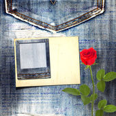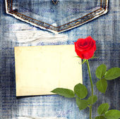 Stara pocztówka vintage z piękną czerwoną różą na blue jeans backg