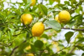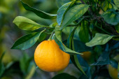 Żółte pomarańcze owoce cytrusowe wiszące na drzewie pomarańczowym w ogrodzie z bliska