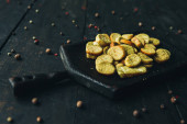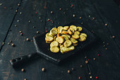 pyszne piękne smaczne solone migdały przystawka na ciemnym drewnianym desce do krojenia na ciemnym drewnianym stole