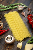 Spaghetti i składniki na starym i zabytkowym drewnianym stole. Kuchnia włoska. Smaczne jedzenie..