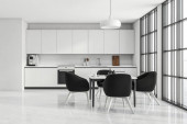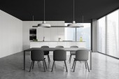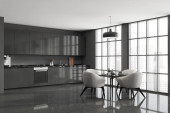 Panoramiczny szary pokój kuchenny ze stołem jadalnym, czterema białymi fotelami i szafką kuchenną. Betonowa podłoga. Koncepcja nowoczesnego projektowania apartamentów. 3d renderowanie