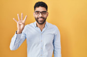 Zdjęcie "Młody Latynos w ubraniach i okularach, pokazujący i wskazujący palcami numer dziewięć, uśmiechnięty pewny siebie i szczęśliwy.. " może być wykorzystywane do celów osobistych i komercyjnych zgodnie z warunkami zakupionej licencji Royalty-free. Obraz jest dostępny do pobrania w jakości wysokiej rozdzielczości do 5760x3840.