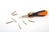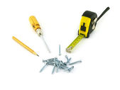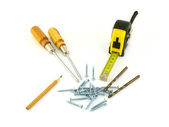 śrubokręt i śruby z dovels na białym tle na białym tle