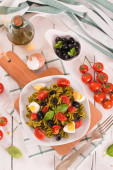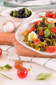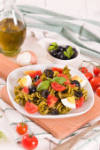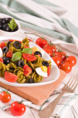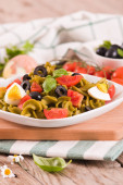 Fusilli pasta with cherry tomatoes, eggs and black olives.
