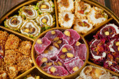 Wschodnie słodycze z orzechami, cukierki, daty w tle pudełka, zbliżenie