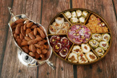 Wschodnie słodycze z orzechami, cukierki, daty w tle pudełka, zbliżenie