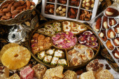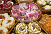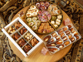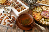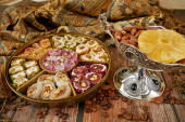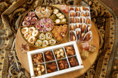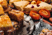 Wschodnie słodycze z orzechami, cukierki, daty w tle pudełka, zbliżenie