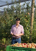 Zdjęcie "Młody rolnik uśmiecha się trzymając drewnianą skrzynię z pomidorami obok roślin w szklarni" może być wykorzystywane do celów osobistych i komercyjnych zgodnie z warunkami zakupionej licencji Royalty-free. Obraz jest dostępny do pobrania w jakości wysokiej rozdzielczości do 5760x3840.