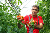 Młody rolnik uśmiecha się trzymając drewnianą skrzynię z pomidorami obok roślin w szklarni