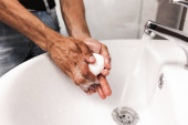 Mężczyzna myje ręce mydłem w zlewie, zdjęcie z bliska