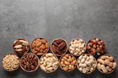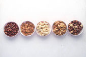 Różne rodzaje orzechów: orzeszki ziemne, orzechy sosnowe, nerkowce, migdały, orzechy laskowe, orzechy włoskie i pistacje na białym tle. Widok z góry