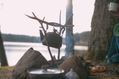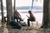 Zdjęcie "Małżeństwo rozbija obóz turystyczny na brzegu jeziora. Obóz pieszy z ogniskiem w lesie. Mężczyzna i kobieta postawili razem namiot." może być wykorzystywane do celów osobistych i komercyjnych zgodnie z warunkami zakupionej licencji Royalty-free. Obraz jest dostępny do pobrania w jakości wysokiej rozdzielczości do 5760x3840.