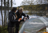 Małżeństwo rozbija obóz turystyczny na brzegu jeziora. Obóz pieszy z ogniskiem w lesie. Mężczyzna i kobieta postawili razem namiot.